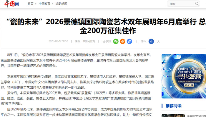 【中國(guó)網(wǎng)】“瓷的未來(lái)”2026景德鎮(zhèn)國(guó)際陶瓷藝術(shù)雙年展明年6月底舉行 總獎(jiǎng)金200萬(wàn)征集佳作